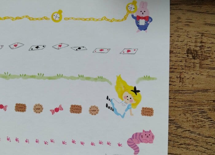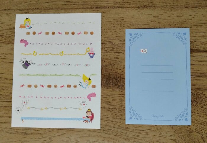 こちらは『不思議の国のアリス』デザインのレターセットです。アリスやうさぎ、ハートのクイーンといったキャラクターがかわいいです。