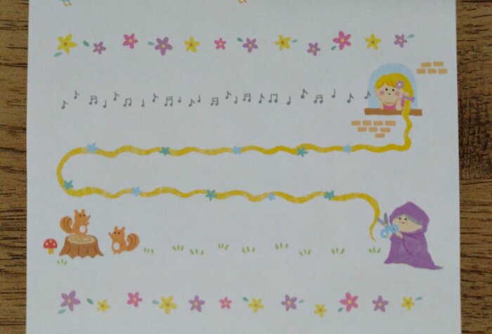 長い髪や歌声が罫線になっています。魔女がラプンツェルの髪を切ろうとしているなど、物語を感じられるイラストになっているのもおしゃれです。