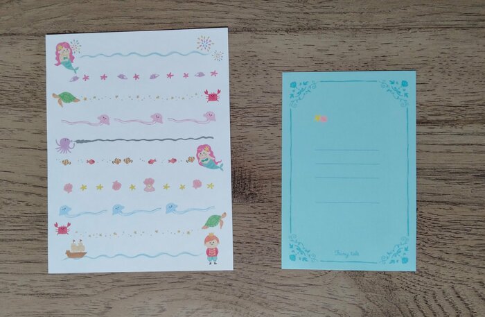 こちらは『人形姫』デザインです。深海のようなカラーの封筒と、人形姫や王子様がかわいくデザインされた便せんがセットになっています。