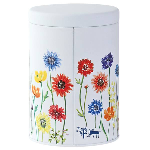 今年のキャニスター缶はお花畑をイメージしており、春らしい色とりどりの花のイラストが全面にデザイン。キッチンに置くだけで、お部屋にお花が咲いているかのような華やかなデザインです。