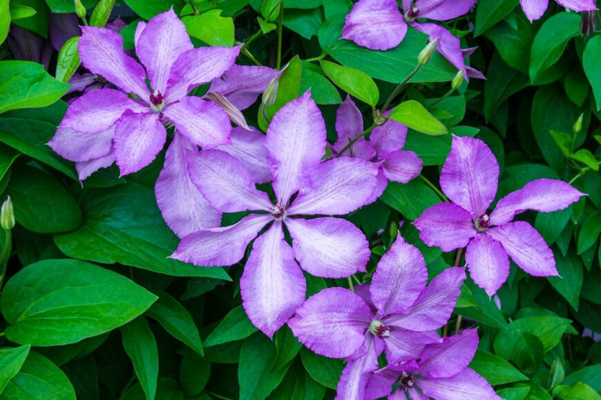 クレマチスは大きく咲き開く花が華やか。ツルを絡ませながら伸びるので、フェンスに沿わせたり、壁に這わせたりするとオシャレです。前年に伸びた枝から開花する旧枝咲きの品種を選べば、切り戻しする手間が省けます。