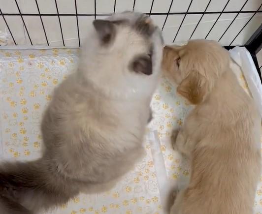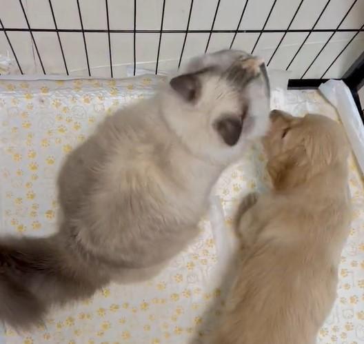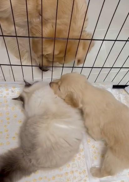 「猫に寄っていく生後45日目のゴールデンレトリバー子犬」そんなコメントとともに投稿されたのは、1本の動画でした。