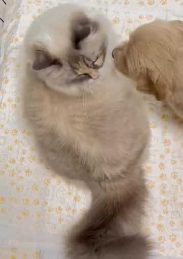 動画の冒頭には、猫の女の子「お茶子」ちゃんと子犬の姿があります。お茶子ちゃんに近づくワンちゃんは、同居するゴールデンレトリバーの「ぷぅ」ちゃんから産まれた子犬です。