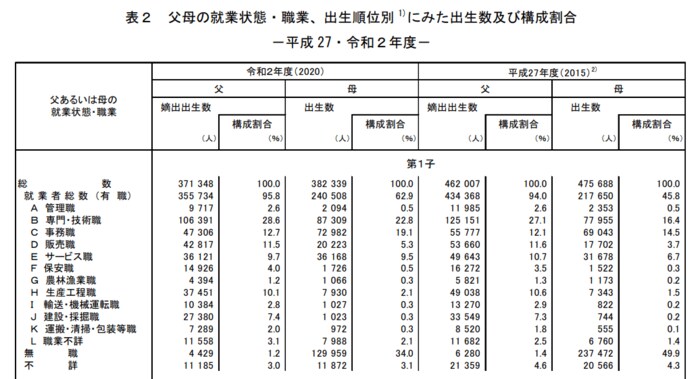 厚生労働省が2023年3月3日に公表した「令和2年度(2020) 人口動態職業・産業別統計の概況」によると、第1子のうち「母が有職であるもの」は24万508人(第1子全体の62.9%)となりました。