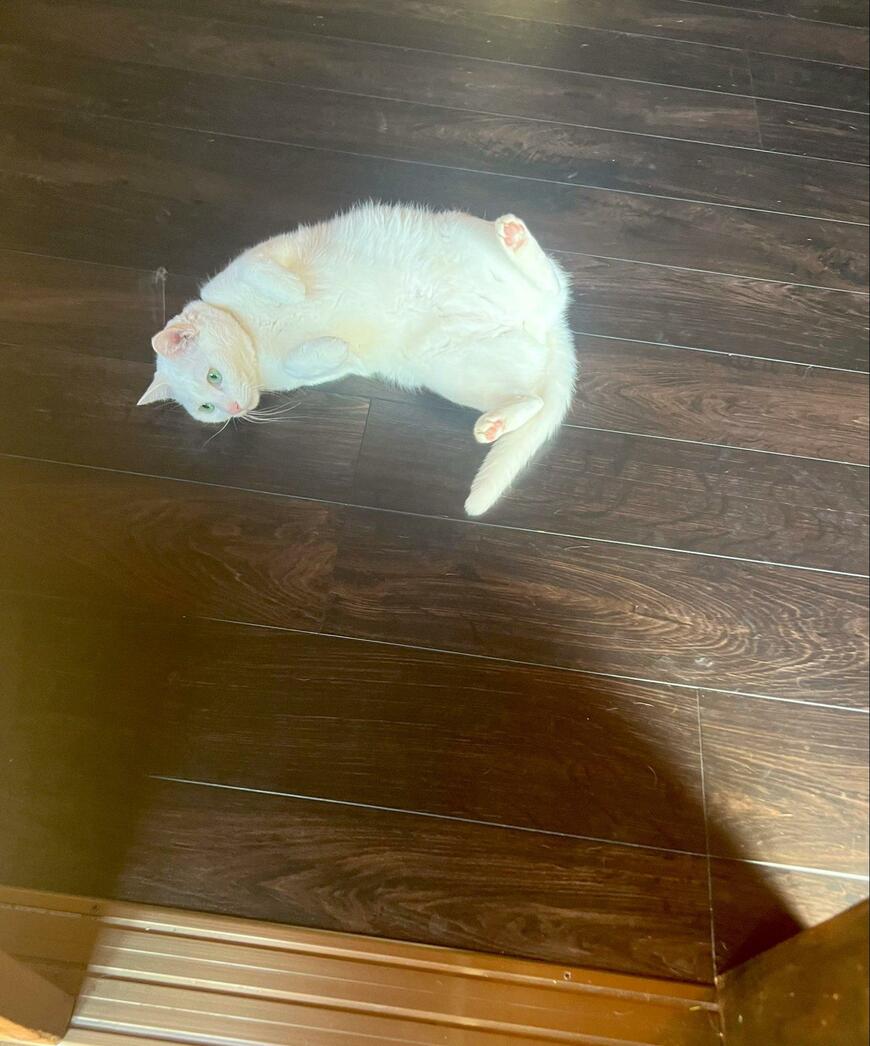 この日も白猫さんは、床に寝そべりスタンバイ!1枚目の写真には、遊ぶ準備は万端といった具合にお腹を出して寝転がる猫さんの姿がありました。