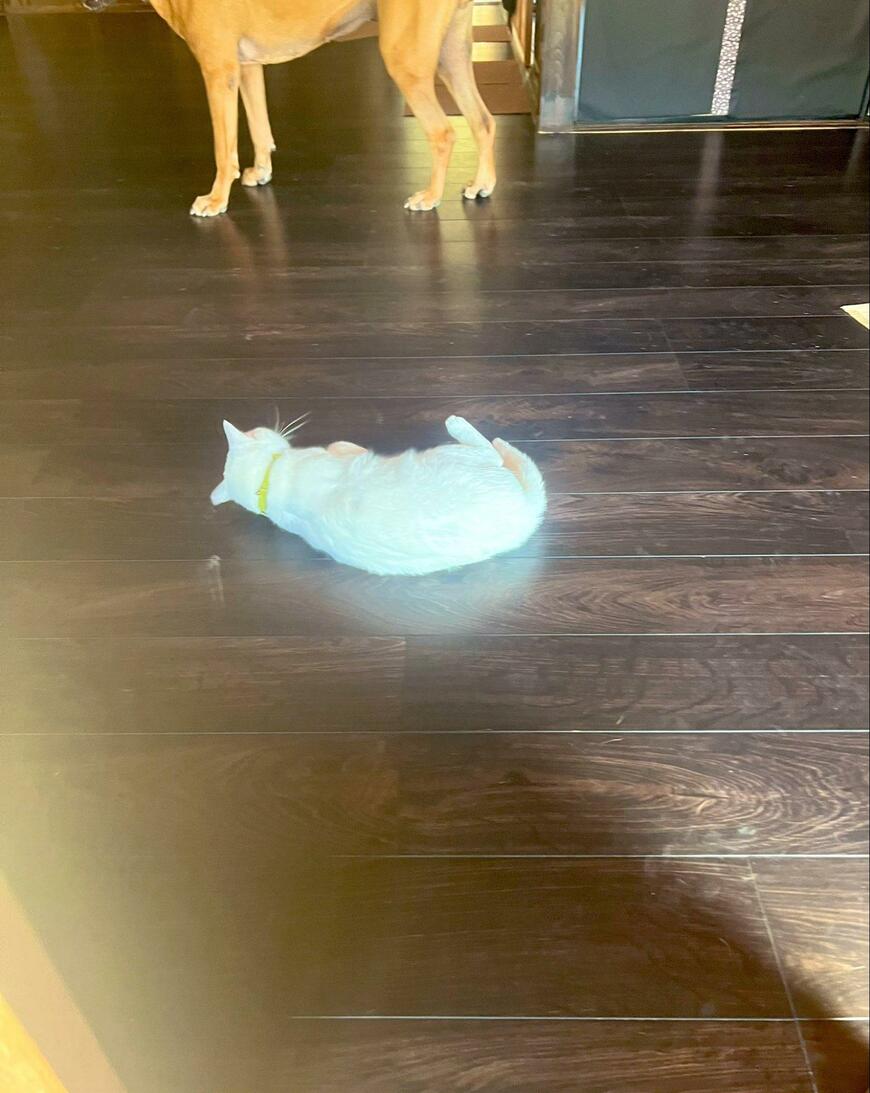 どうやらワンちゃんは、猫ちゃんの近くを颯爽と通過していったようです……!この時は遊びの気分ではなかったのかもしれませんね。