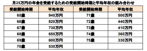 4.1 年金を月25万円の年金を受け取るための受給開始期間と平均年収の組み合わせ
