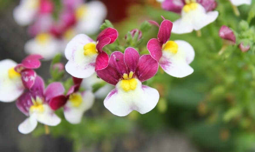 花の形が特徴的なネメシアは花壇の主役にもなる多年草。複色の品種はとても可愛らしく、数株植えると華やかな雰囲気になります。夏は高温多湿を避けて管理をしましょう。秋に切り戻しをおこない、春の開花に備えます。※参考価格:200~400円前後(3号ポット苗)