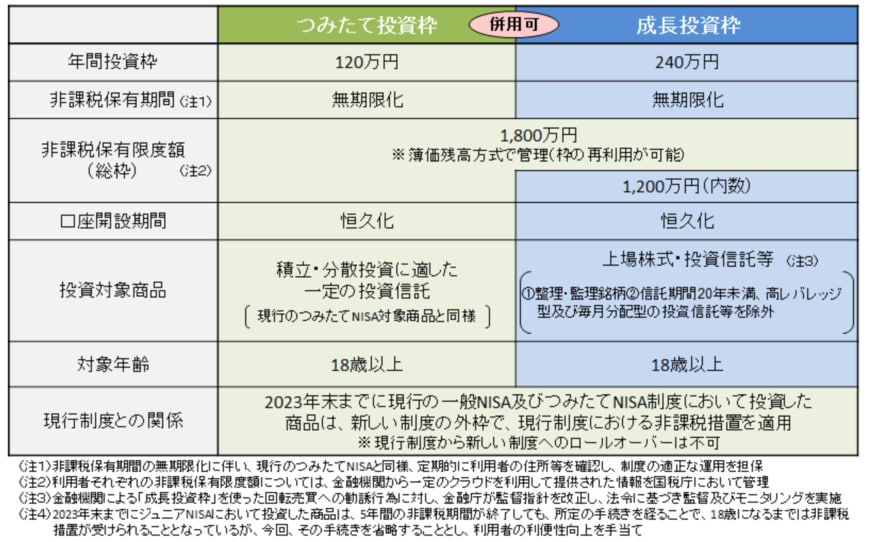 現行のつみたてNISAは「つみたて投資枠」に、一般NISAは「成長投資枠」に名前を変えて併用が可能になる予定です。非課税保有限度額は1800万円となっており、一般的な家庭には使い切れないほどの投資枠が付与されます。