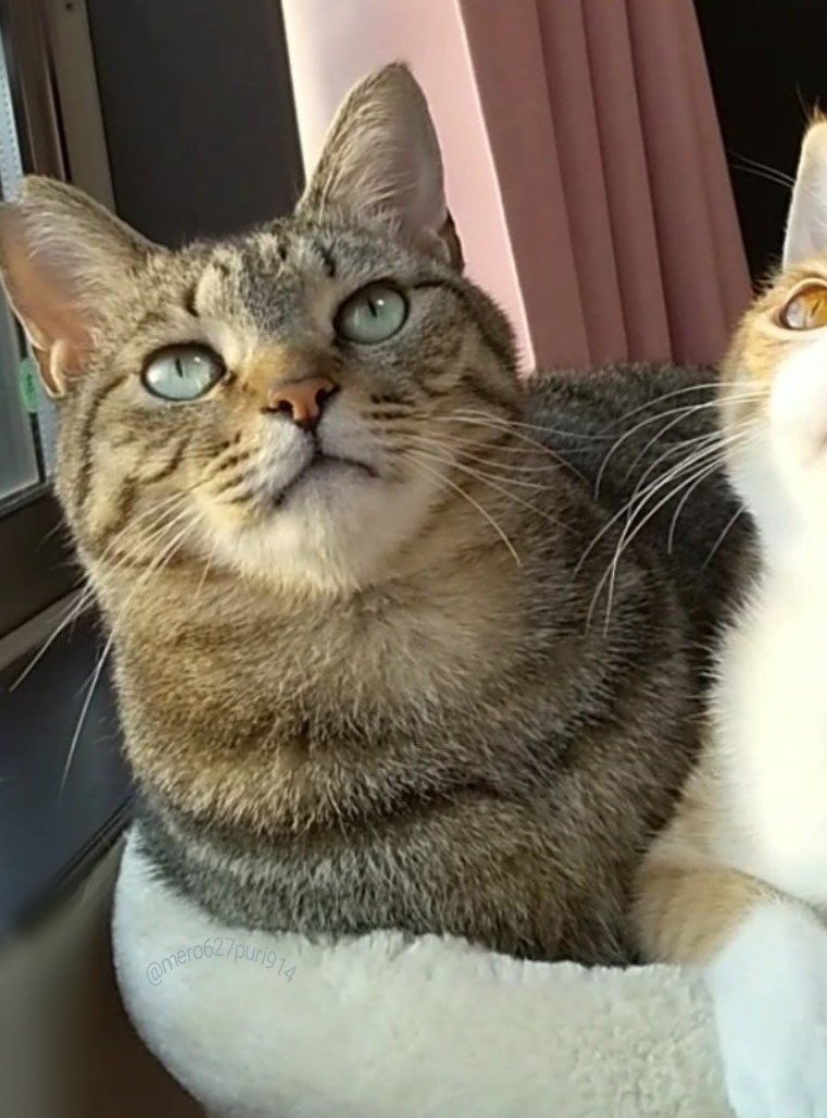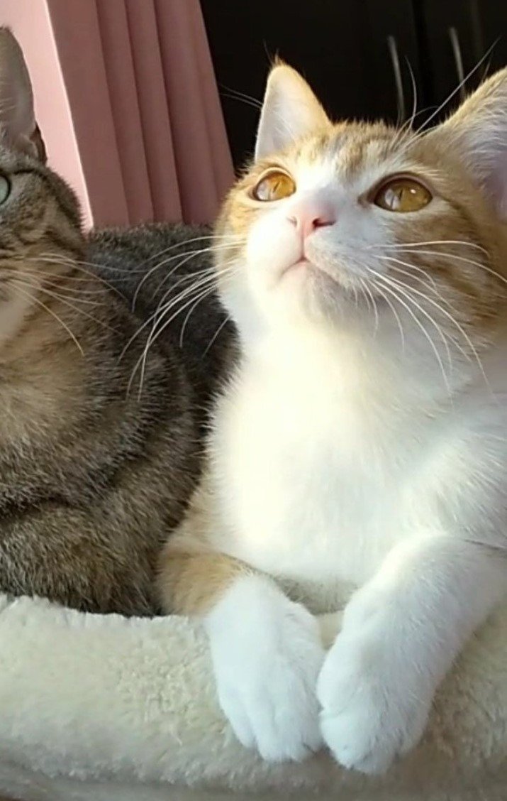 はちみつ色の瞳をキラキラと輝かせ、口角を少々上げた表情は「ニコッ」としているようにも見えます。大好きなお兄ちゃんの隣でくつろぐ時間がとっても嬉しかったのかもしれませんね……!