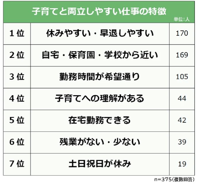 株式会社ライズ・スクウェアの調査によると、子育てと両立しやすい仕事の特徴として、「休みやすい・早退しやすい」ことが1位に挙げられました。