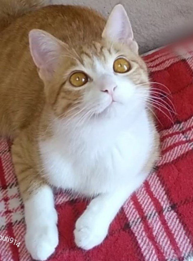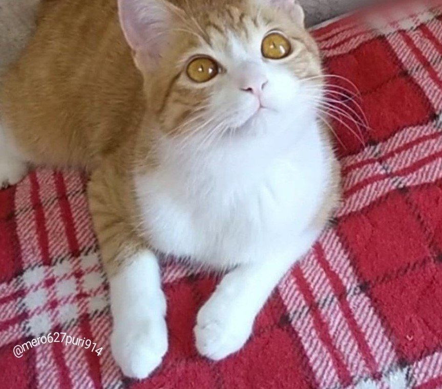 赤いお布団の上に座り、リラックスしている様子のプリンちゃん。はちみつ色の瞳をキラッと輝かせて、上目遣い気味に一点を見つめていますね。