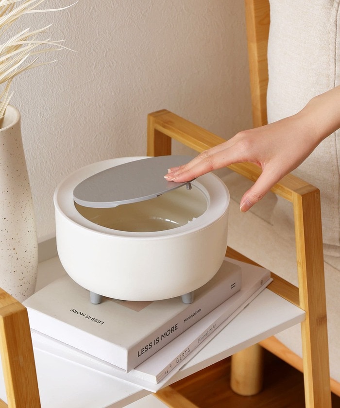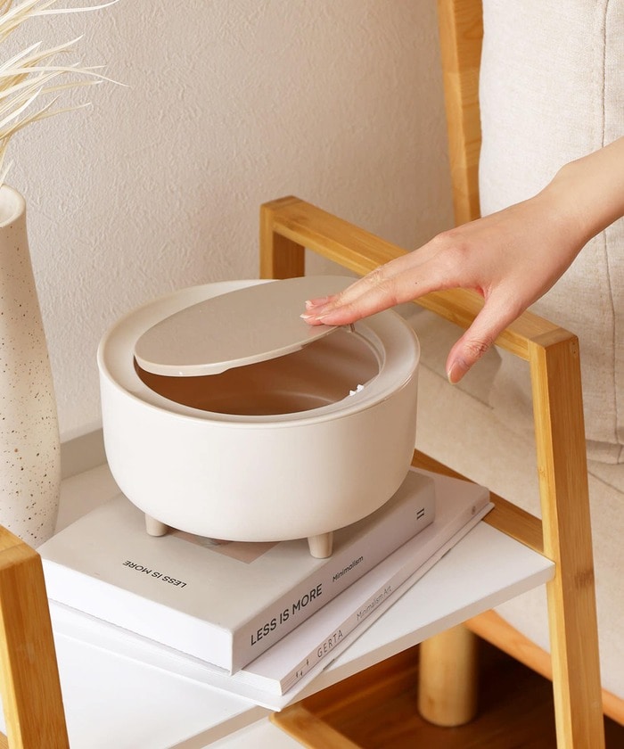 蓋のくぼみを押すと蓋が開くプッシュオープン式ダストボックスです。卓上に置けるちょうどよいサイズ。カラーは2色を展開し、どちらもナチュラルな色味なのでインテリアに馴染みやすいのもうれしいですね。