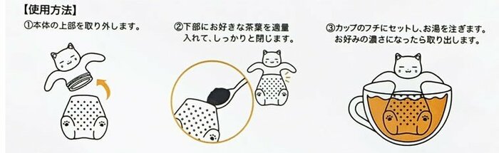 中央から開いて、下部に好みの茶葉を入れます。猫の両手部分をコップのフチにひっかけて、お湯を注ぎます。お好みの濃さになったら、猫を取り出します。