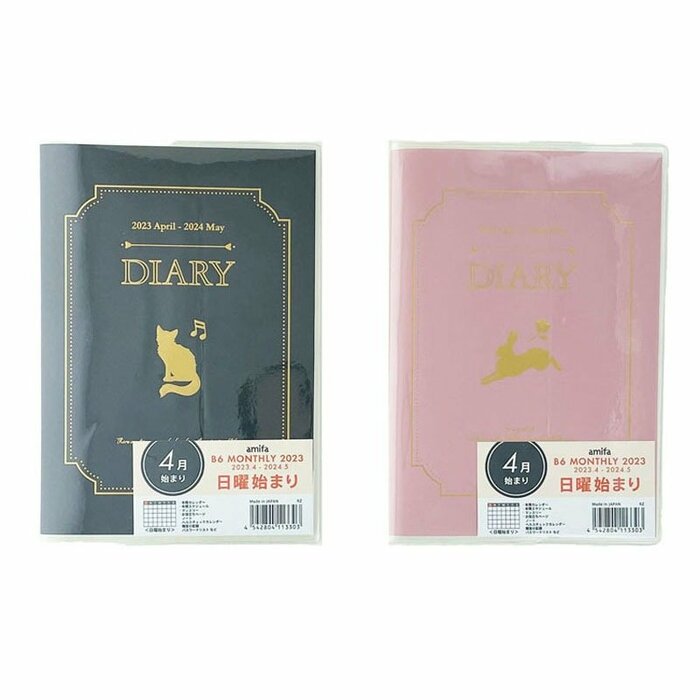 これから使える「4月始まりのダイアリー」です。ゴールドのDIARYという文字と枠がおしゃれなアイテムとなっています。猫デザインだけでなく、今年の干支のウサギバージョンもあります。