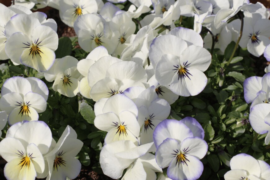 カラフルな花色がお洒落なパンジーとビオラは、ホワイトカラーも見逃せない美しさです。