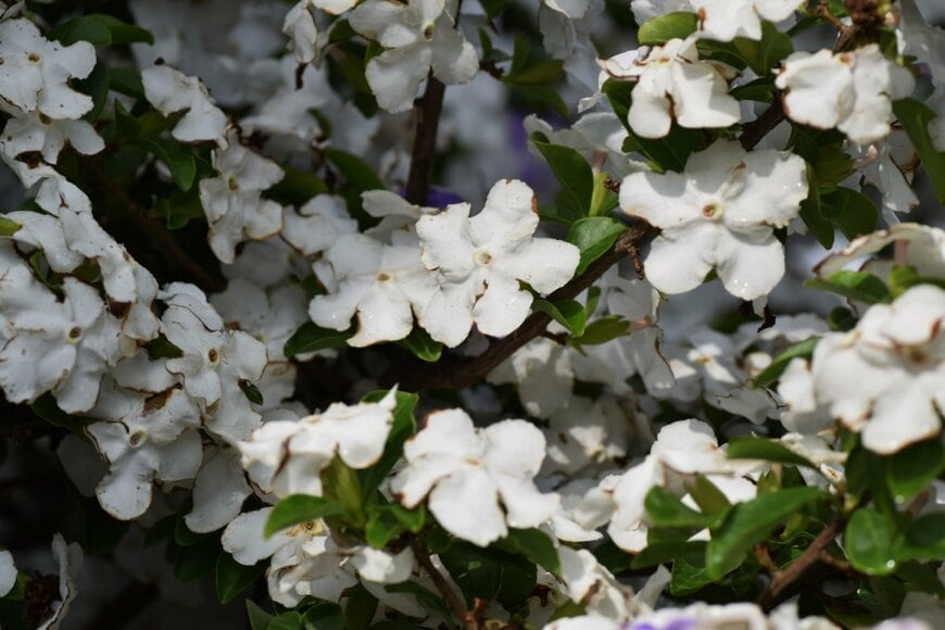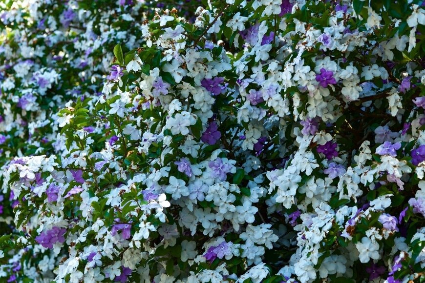 花色がパープルからホワイトに変化するニオイバンマツリ。鉢植えでも育てられる低木で、花に芳香があります。