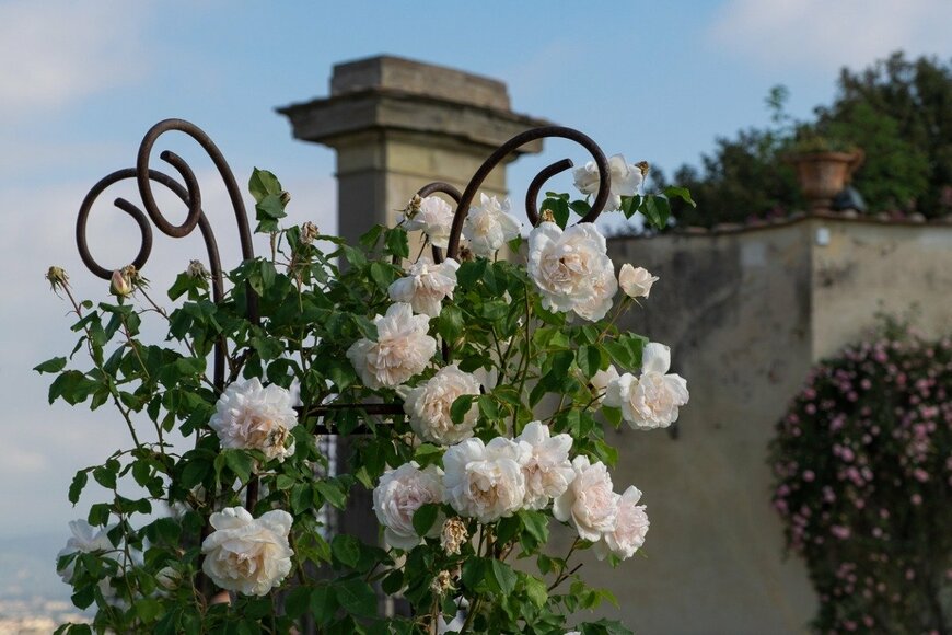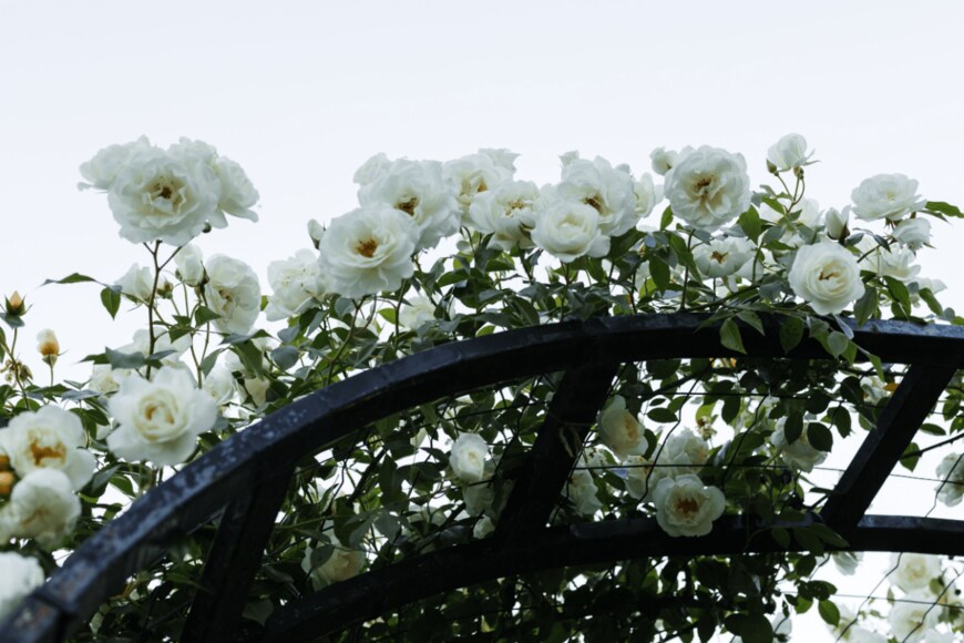 庭にゴージャスな雰囲気を加えたいときは、つるバラがオススメ。
