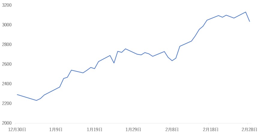 日本製鉄(5401)の株価は2023年に入って堅調に推移しており、2022年12月30日に2292円だったところから、2023年2月28日時点では3037円と32.5%も上昇しました(いずれも終値ベース)。