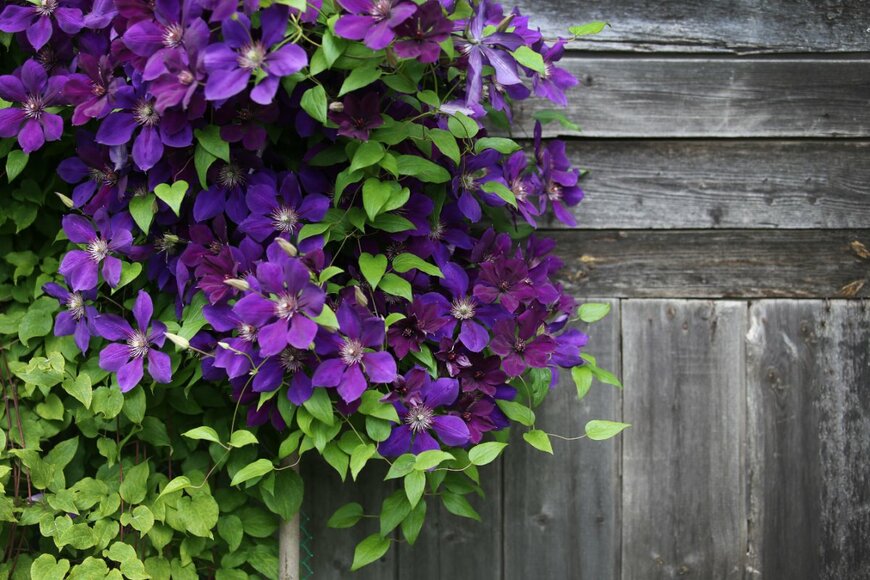 クレマチスは細い茎をからませながら長く伸びるツル性植物。鮮やかな色合いの花が壁やフェンスをおおうように咲き開くと見応えがあります。※参考価格:300~1000円(3~4号ポット苗)
