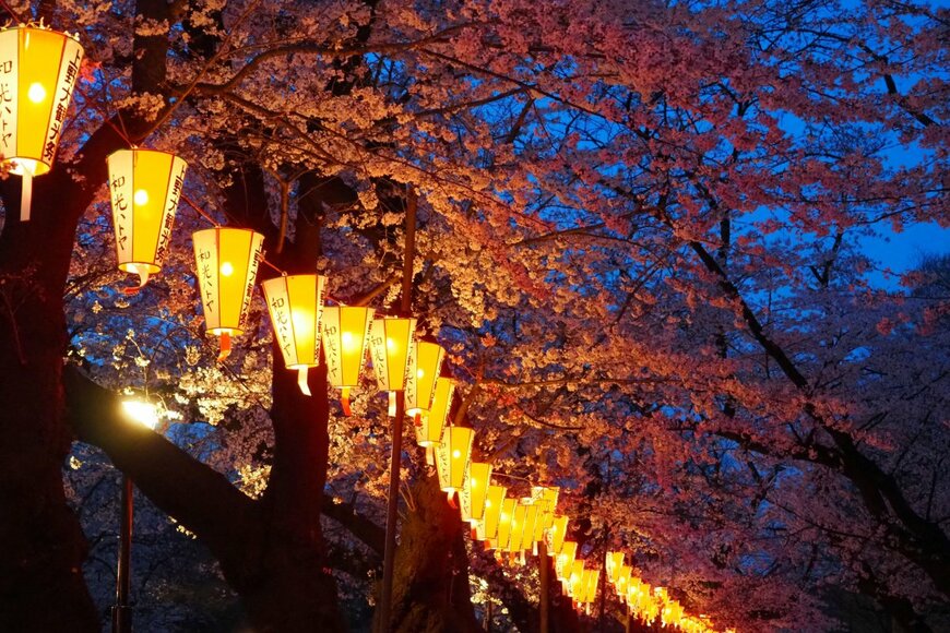 毎年多くの花見客で賑わう「うえの桜まつり」を開催しており、2023年は3月17日~4月9日まで開催予定。夜になると桜並木に約800個のぼんぼりが灯され、夜桜のライトアップを楽しめます。