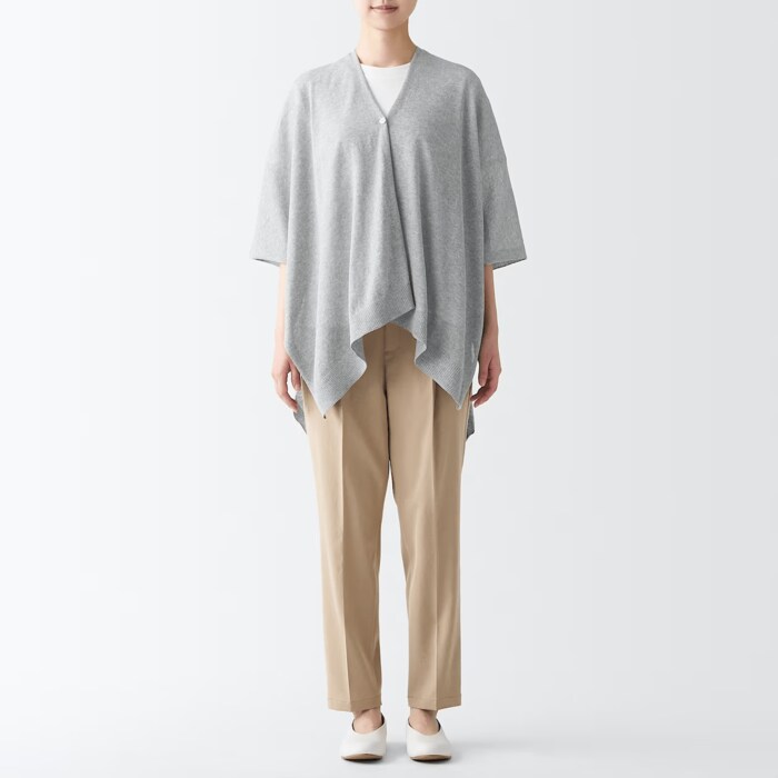 羽織ったり巻いたりできるさらりとした肌触りのボレロです。新たにボタンが付きサッと着られるようになりました。綿はオーガニックコットンを使用しています。
