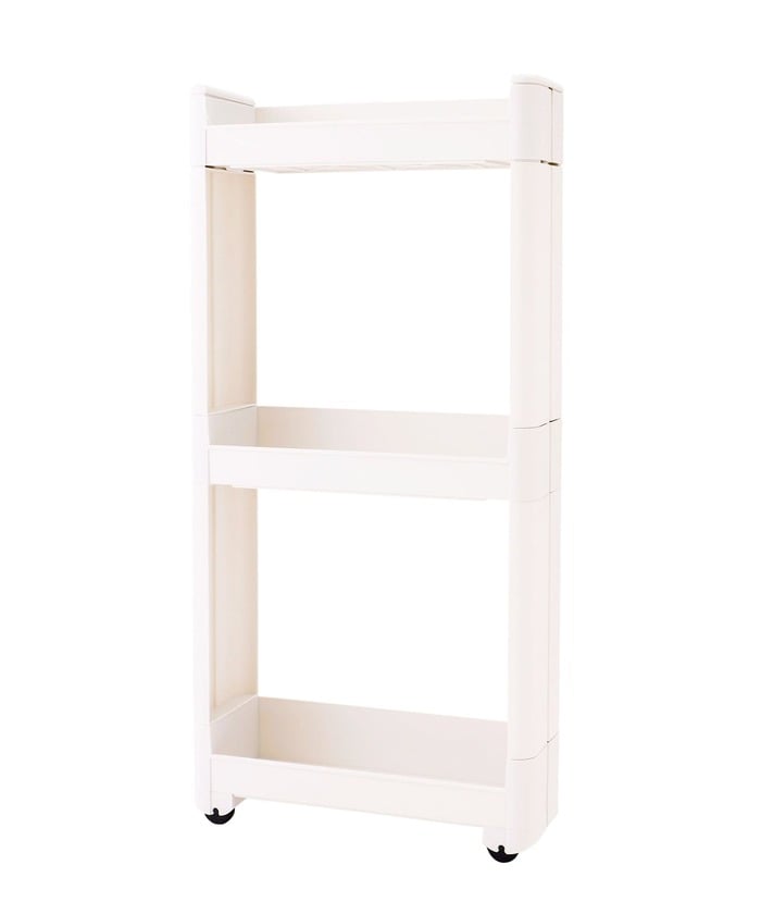 わずかな隙間を有効活用できる収納アイテムです。キッチンでよく使う調味料やボトル類の収納、ストックの保管場所として使用できます。まっすぐ動くコロ(脚輪)が付いているので、使用時・収納時の移動もスムーズ。また、パーツも差し込み式で組み立ても簡単なのもうれしいですね。