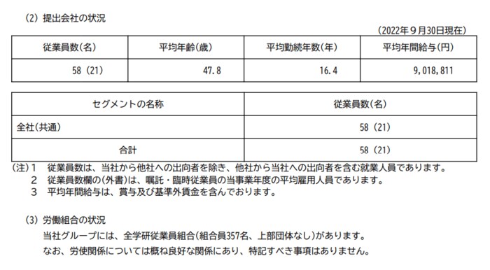 学研ホールディングス(提出会社)の2022年9月末時点での従業員数、平均年齢、平均勤続年数および平均年間給与は以下の通りです。