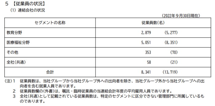 学研ホールディングスの給料はいくらか。平均年齢・勤続年数も【2022年版】 就職と転職の企業調査・分析シリーズ 2023.03.25 03:50 公開 執筆者LIMO編集部 copy URL 目次[開く] 1. 学研ホールディングスの平均年間給与はいくらか 2. 学研ホールディングスの従業員数は何人か 3. まとめにかえて 参考資料 2. 学研ホールディングスの従業員数は何人か また、連結会社における従業員数は以下の通りです。 出所:学研ホールディングス「有価証券報告書」 教育分野:2879人 医療福祉分野:5051人 その他:353人 全社(共通):58人 合計:8341人 3. まとめにかえて < 1 2 3 4 > 関連タグ #就職 #転職 #学研 #年収 注目コンテンツ 持病があっても入りやすい医療保険。人気の保険はこの保険![PR] 女性特有のがんは40代から増える?女性向け医療保険で備える[PR] 働けなくなった時の備えはできている?人気の就業不能保険をチェック[PR]