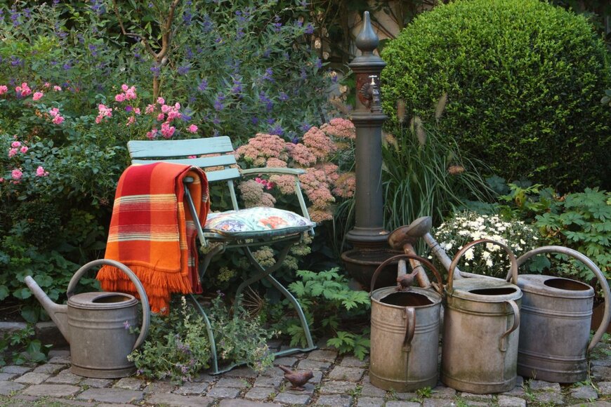 庭に木製のベンチや鳥が水浴びできるバードバスなどを置くと、庭のワンポイントとして役立ちます。ブリキ製のジョウロやアンティーク調のガーデン用具もオシャレな小物に。