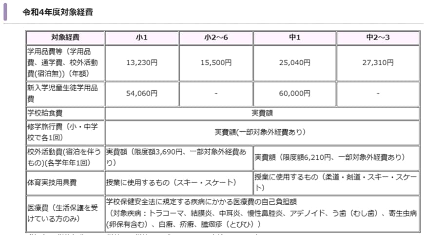 支援の内容は、学用品費等、学校給食費、修学旅行費、校外活動費(宿泊を伴うもの)、体育実技用具費(授業に使用するもの)、新入学児童生徒学用品費等、医療費(生活保護を受給しているかたで、学校保健安全法で規定している疾病にかかる医療費のみ)などです。