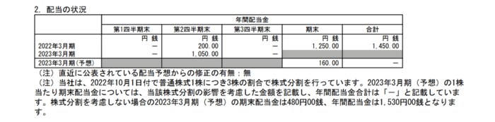 日本郵船の株式を1年前に買い、持ち続けたとすると、「2022年3月期の期末配当と2023年3月期の中間配当」の計2回を受け取ることができます。
