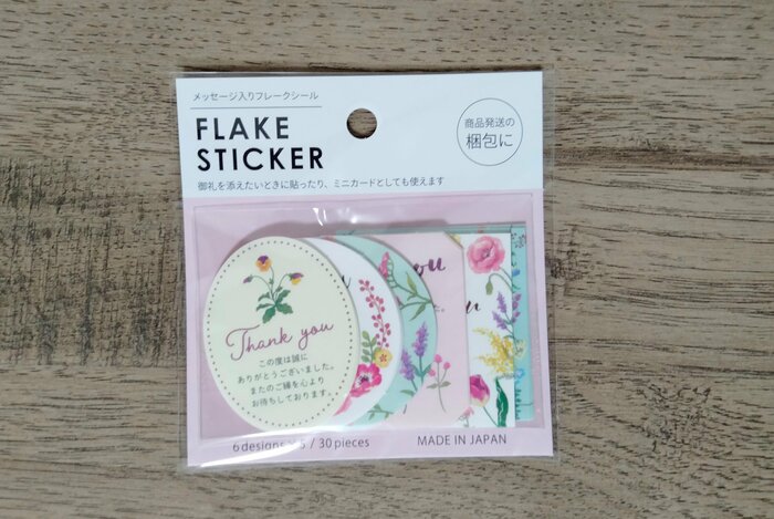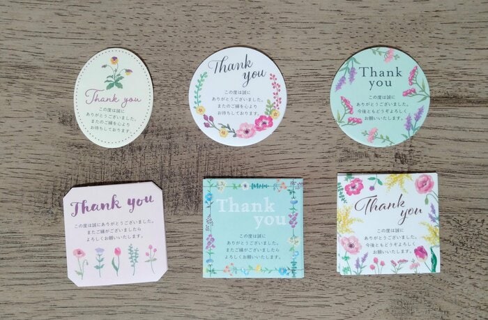 そんな手間から解放してくれそうなアイテムです。「この度はありがとうございます」といったお礼のメッセージが入っています。シールになっているので商品に貼り付けることもできます。