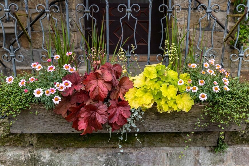 「鉢の顔」となるメインの花は、玄関や外壁、玄関扉と相性が良い色を選ぶと一体感が出てオシャレに魅せることができますよ。周囲の花はメインを引き立てるような草丈、あるいは花色をもつ植物をセレクトしましょう。