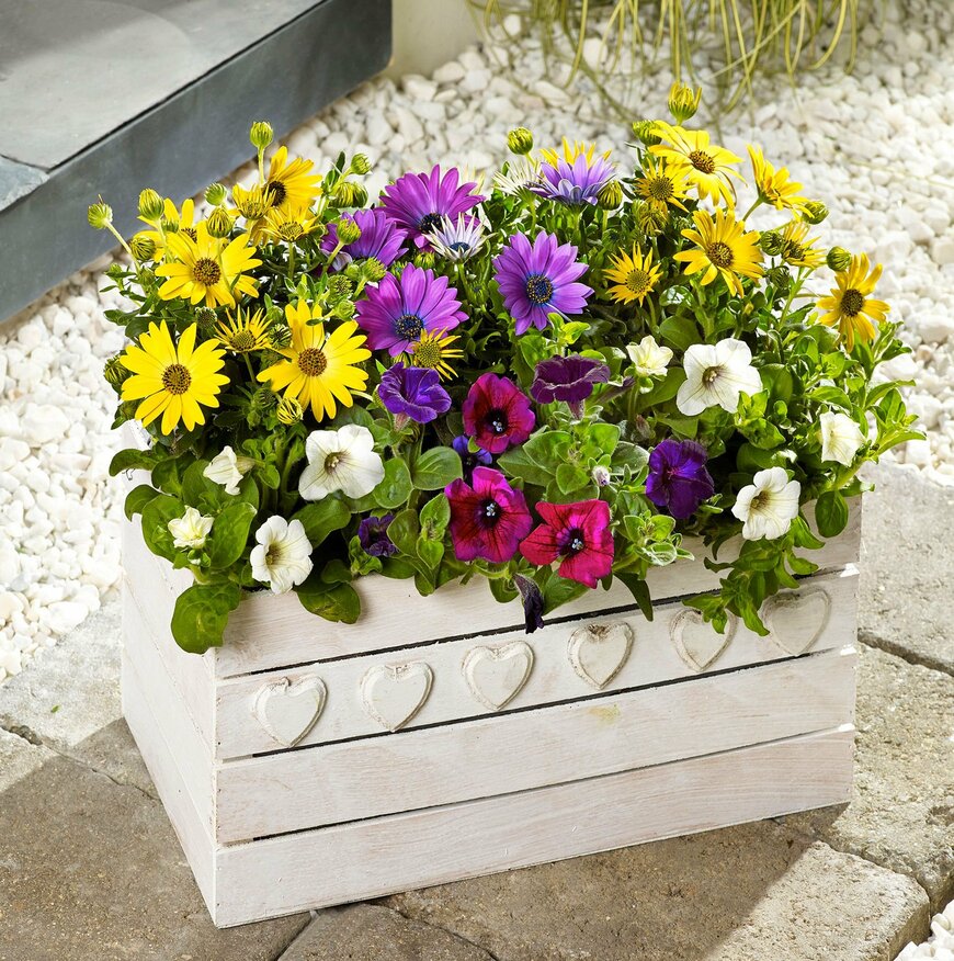 写真の寄せ植えは、後列に紫と黄色のオステオスペルマムを、前列に紫と白のカリブアコアを配置したもの。花の色の一部と鉢の色を合わせたことで、反対色がメインながらもまとまりのある仕上がりになっています。