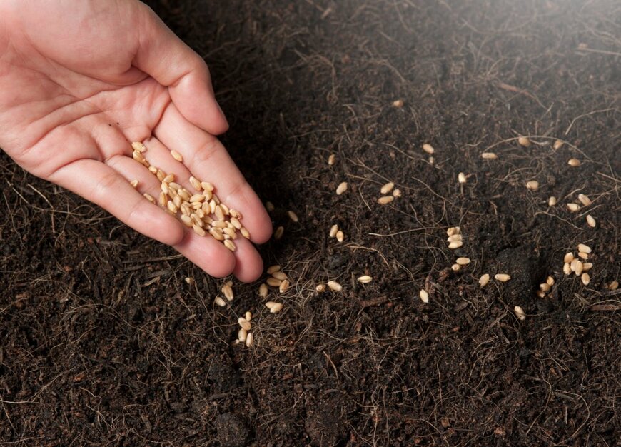 土の上にバラバラと種を播く方法。小さな種を播くときに向いています。