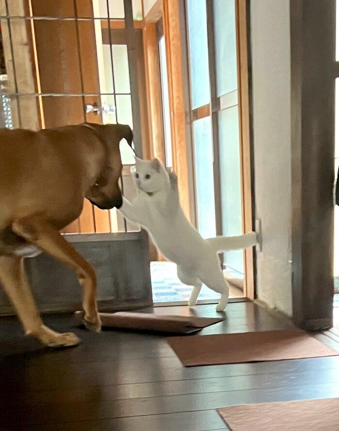 土佐犬さんに思いきりじゃれる白猫さん。仲睦まじい日常風景がTwitterで話題に