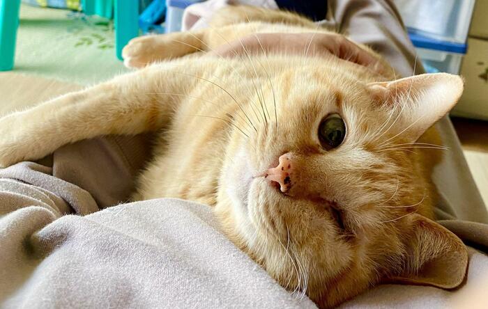 保護猫のモカくんは子猫の頃にひとりきりで野鳥と戦い、片目を失う大怪我を負ってしまったといいます。保護されたのち投稿主さんご家族の一員となり、日々たくさんの愛を受けながらすくすくと成長を遂げました。