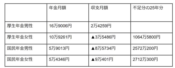 年金月額と毎月の支出の差額(収支月額)と赤字の場合の25年分をまとめると、以下のようになります。