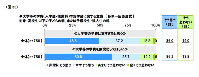 ソニー生命株式会社が大学生以下の子どもがいる20歳以上の男女1000名に対して行った「子どもの教育資金に関する調査 2023」によれば、「大学等の学費は高すぎると思う」に対して、「非常にそう思う」が48.8%、「ややそう思う」が 37.2%となっており、そう思う(計)」は86.0%でした(2023年3月9日公表)。