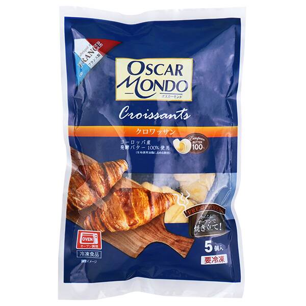 ヨーロッパ産発酵バターを使ったこだわりの冷凍クロワッサンです。5個入り。凍った商品を袋から取り出し、十分に間隔を開けてオーブン皿に並べ、室温で20~30分程度解凍。軽く押して生地が柔らかくへこむ程度になったら、予熱した180℃のオーブンで25分程度焼くことで、2.5倍くらいの大きさに焼きあがります。ホテルなどの業務用としても活躍する商品です。
