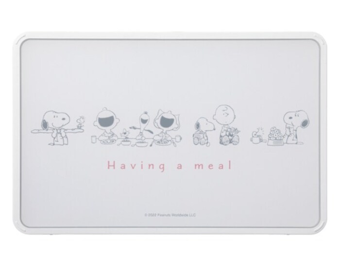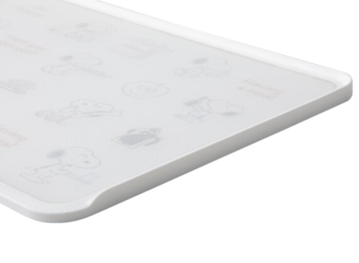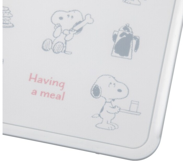 表面には食材をこぼしにくいガード付きで、軽くて使いやすい「スヌーピーのカッティングボード」。ほかにも、ガードに包丁が当たらず安心して使える仕様になっています。コーナーにストッパー付きで、裏面はフラットに使えます。