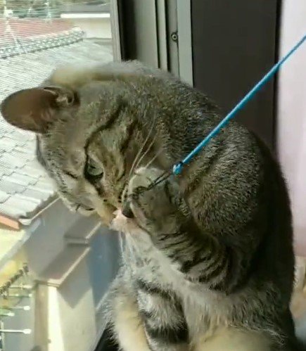 気づかないような素振りを見せていたメロンくんでしたが、飼い主さんがおもちゃをゆっくりとお顔の前に近づけると……?メロンくんは一瞬の隙に片手でキャッチ!落ち着きある狩り姿がとってもクールです。