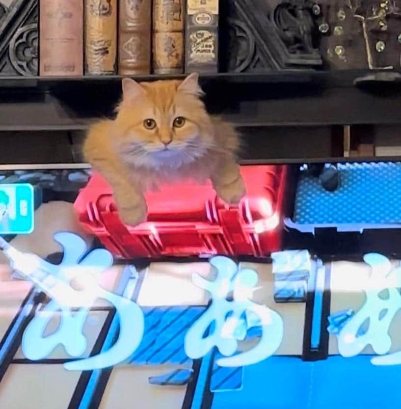 テレビの上には、ひょっこり生えるように顔を出す猫ちゃんの姿がありますね。