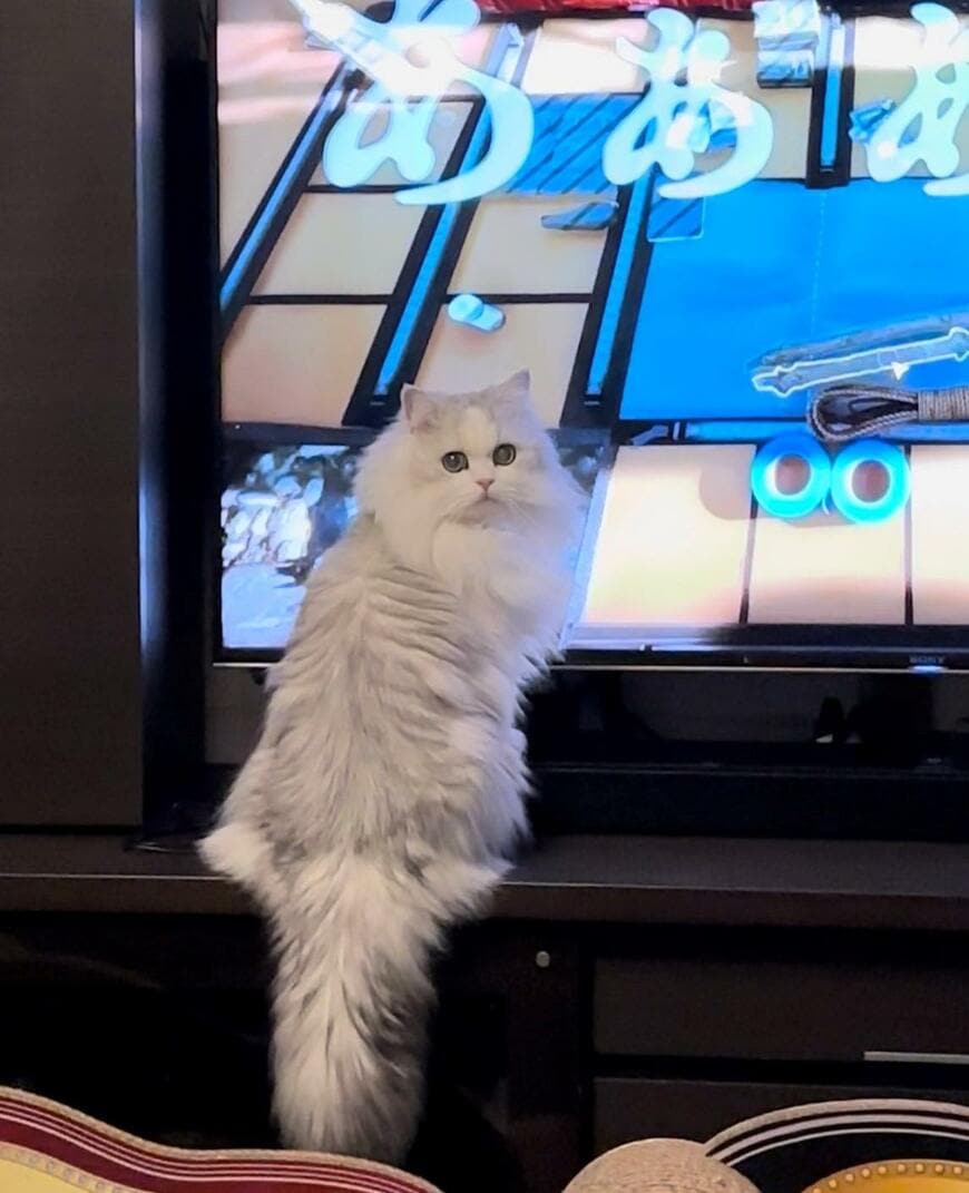 テレビの下側には、白くてフワフワの毛並みをした猫さんが座っていました。