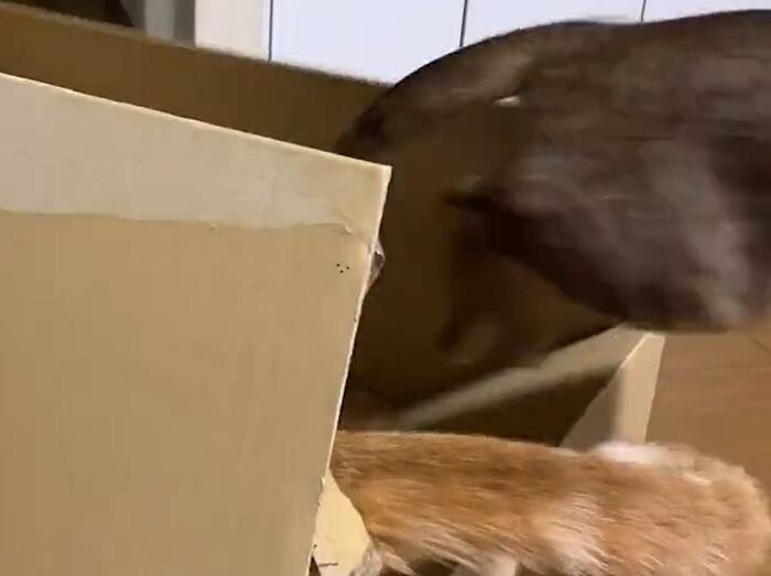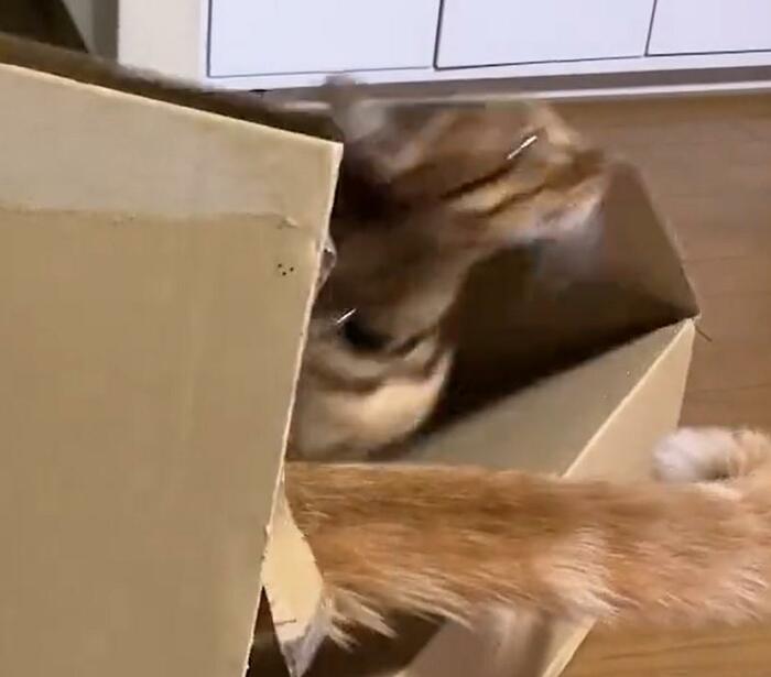 モゾモゾと体を動かして、箱への突入に成功した猫ちゃん。すると箱の中から「もう1匹の猫ちゃん」が猛スピードで飛び出してきました!どうやら先客が居たようですね。