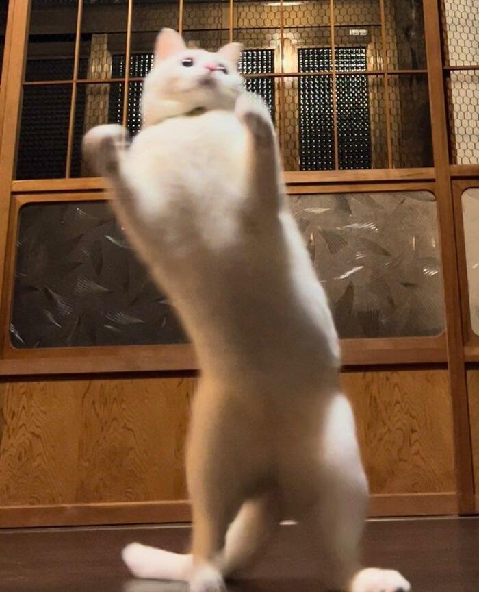 1枚目の写真には、2本足をしっかりと着地させて両手を前に出す猫さんの姿がありました。下半身でバランスをとり上半身を少しクネッと曲げた格好は、まるでダンスをしているかのよう!思わず笑みがこぼれてしまいます。