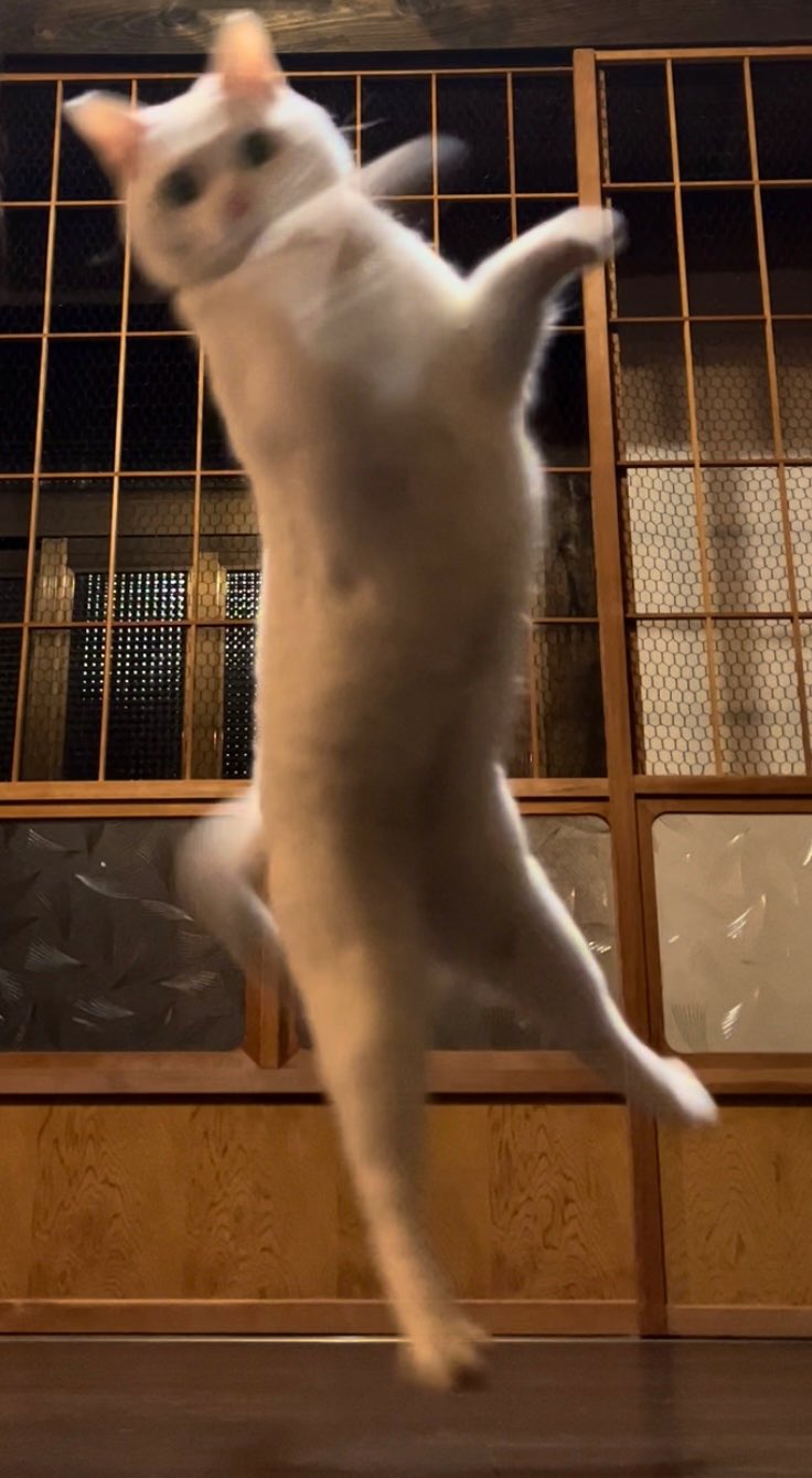 猫さんは豪快でキレのあるジャンプを披露しています。左足をちょこんと放り出し、真っ白な体をピシッと伸ばす姿に圧倒されます……!