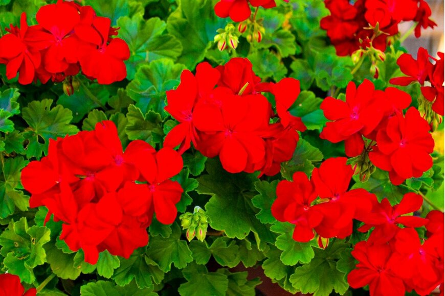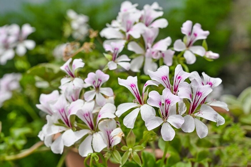 ゼラニウムは環境が合うと、一年中花を咲かせることもある多年草。春から晩秋までホワイトやピンク、レッドの個性的な花を咲かせます。香りが楽しめる「センテッドゼラニウム」は野趣あふれる花も魅力です。※参考価格:300~800円前後(3号ポット苗)