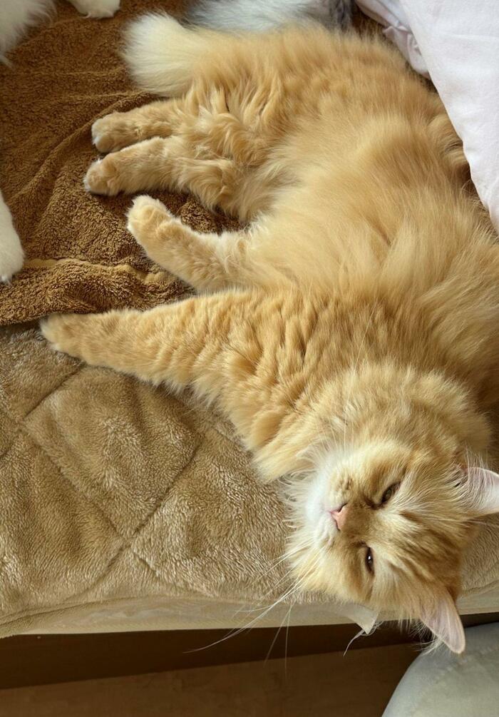 手前側に写る「エマ」ちゃんはすでに眠っていたのでしょうか、薄く目を開けて「眠いニャ……」といった表情を浮かべています。堂々と横たわり手足を投げ出す姿がなんとも可愛らしいですね。